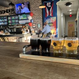 Sonder is one of the better breweries I visited in the Cincy area. It is also very commercial. Huge place and it was completely full when we got there (just after 5 PM). We fortunately found spots at the bar, as the beertenders were extremely helpful. Too cold to go outside, but there is ample seating there, as well. The place is very commercial looking with high ceilings and ample floor space. Across the room is a food window for the BrewRiver kitchen (reviewed separately, as it is a separate business) and the bar sits up against the wall towards the back of the main taproom. The tap menu is extensive. There were 32 on tap the day we were there, with additional offerings in cans. Based on my samplings, I would say their wheel house is in hazy IPAs, not so much in stouts, with some interesting sours. The Blue Ice Cream beer (pictured) is one of the most interesting brews I have had in awhile (my friend recognized the blue ice cream from King's Island, but I have never been, so it was lost on me). If you want a view of the food, look up BrewRiver in Mason, Ohio for more. If I lived in the area, this would be a nice spot to go to. It is a bit big to be my "cheers", but I could definitely spend a few days to get through their tap list. I will return if I am in the area and can carve out the time to head up.